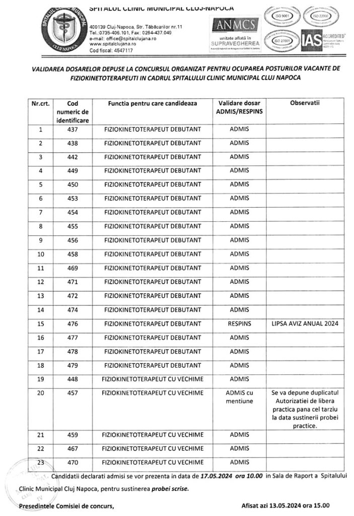 Proba practică la concursul pentru ocuparea posturilor de fiziokinetoterapeut în cadrul Spitalului Clinic Municipal Cluj-Napoca se va susţine în data de 27.05.2024 începand cu ora 10.00.