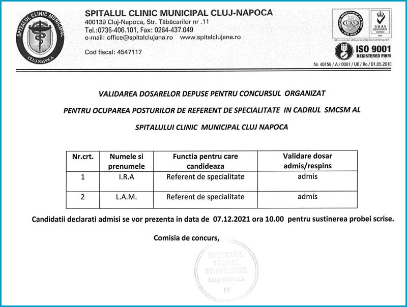 Având în vedere situația epidemiologică generată de infecția cu coronavirusul SARS- Cov 2, medicii și farmaciștii rezidenți care au promovat examenul de rezidențiat din sesiunea noiembrie 2021 și au fost repartizați pentru a fi încadrați la Spitalul Clinic Municipal Cluj-Napoca, începând cu 1 ianuarie 2022, vor trimite pe email la adresa runos@spitalclujana.ro următoarele documente: